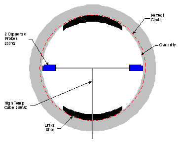 Two non-contact capacitive sensors work in tandem to measure the ovality of the inside diameter of truck brake drums during brake operation to detect deformations caused by extreme braking conditions.On large drum braking systems such as those found on heavy trucks, manufacturers are very concerned about the deformation of the brake drum during high temperature and pressure situations. An example of where these conditions exist is when brakes are applied for long periods of time in high temperature environments. When the combination of temperature and pressure is excessive the drums of these braking systems become deformed. This could occur in emergency braking situations or in prolonged downhill braking. In these cases the drum changes from the normal round shape to an oval shape causing potential malfunction of the braking system.