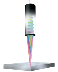 The technology works by focusing polychromatic white light onto the target surface using a multi-lens optical system. The lenses are arranged in such a way that the white light is dispersed into a monochromatic light by controlled chromatic deviation. A certain deviation is assigned to each wavelength by a factory calibration. Only the wavelength that is exactly focussed on the target surface or material is used for the measurement.