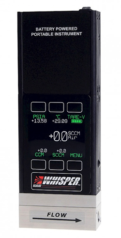 Also feature rich, these instruments offer user selectable engineering units and standard temperature conditions, 5-ms speed of response, stand-alone unit operation for use with or without a computer or PLC, all data visible on one screen (flow, pressure, temp) together with the ability to download data for logging or accountability purposes. A more than capable device would be the Alicat MB Series Portable Mass Flow Meter.