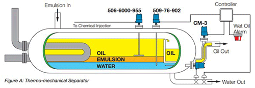 The same Drexelbrook interface transmitter is the basic element, but the addition of an interface switch can warn of emulsion growth, beyond the desired limit. It should be positioned at a level that will be the limit for the upper edge of the emulsion. This switch can be either the Drexelbrook RF type or the "antenna loading" technology. Either type can be on/off or analog output. Generally, the analog instrument is preferable, because it is possible to observe changes, and take corrective action (such as increasing the feed rate of emulsion breaking chemical) before the separator is out of control. It has been suggested that a conductivity sensitive, "antenna loading" sensor be used to limit growth of the emulsion lower edge as well (we make no pretense that RF could handle this function). As discussed previously, a 10% drop in water conductivity will cause the "antenna loading" instrument to sound the "wide emulsion" alarm. Since the growth in oil-continuous emulsion is a good proxy for total rag layer, the bottom edge is not required for reliable control.The use of a composition transmitter on the clean oil line is also of value in this case, as in the previous.