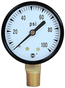 The model P500 is a general-purpose commercial gauge, capable of measuring vacuum pressure, gauge pressure, or compound gauge pressure. These bourdon tube pressure gauges have phosphor bronze or beryllium copper tubes, with brass sockets. The case is black painted steel for durability. All gauge sizes meet ASME B40.100 Grade B accuracy (3-2-3%), and feature ranges from vacuum to 5000 psi. They are also available in low mount or center back connections, and sizes range from 1.5" to 4.5".