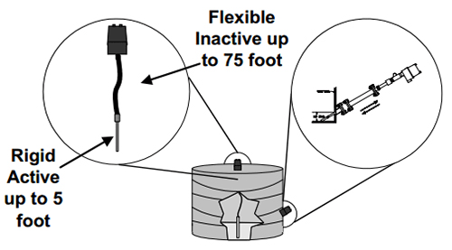 The signal can be used to control automatic water draw-off. For installation convenience, the intrinsically-safe sensing element can be mounted through a side wall of the tank or through the roof. The specific model and measuring area (active length) of the sensing element should be specified to be consistent with the expected maximum height of the water level, mounting considerations and mounting tolerances.