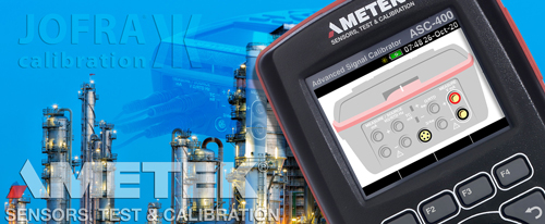 The ASC-400 Multifunction Process Calibrator reads and sources RTD, Thermocouple, Current, Voltage, Frequency, Resistance, and Pulse Train Output. It combines features such as percent error calculation, scaling, leak-testing, and switch test calibrating into one handheld calibrator. The large full-color display, numerical keypad with a cursor, and function keys help simplify use.