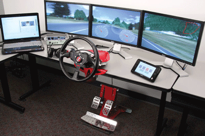 The Desktop NVH Simulator consists of a computer, steering wheel, pedals and two additional screens, which are either mounted on a desk or installed in an actual vehicle for instant, accurate recreation of noise and vibration effects.