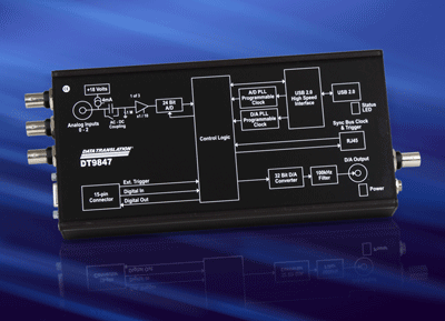 Data Translation announces the release of the new DT9847 series of multifunction USB data acquisition modules for high-precision measurements in audio and acoustic applications. The modules provide up to three 24-bit analog inputs, and up to two analog outputs with a 32-bit D/A converter per channel, depending on the model. This allows the generation of high-accuracy nominal or reference signals with an ultra-low total harmonic distortion (THD) of 102 dB. In conjunction with the high bandwidth of 108 kHz and the wide dynamic range of 123 dB for the inputs, these features combine into a versatile high-precision data acquisition module that is the ideal solution for the development and quality inspection of audio or acoustic components as well as for vibration analysis.The sampling rate of the analog inputs is up to 216 kHz per channel. A 4 mA current source for the IEPE/ICP sensor, AC or DC coupling and gains of 1 and 10 are all individually programmable per channel. Output signals with a voltage level of ±3 V can also be generated at an output rate of up to 216 kHz. In addition, the DT9847 modules provide eight digital I/O channels. All inputs and outputs can be run simultaneously.