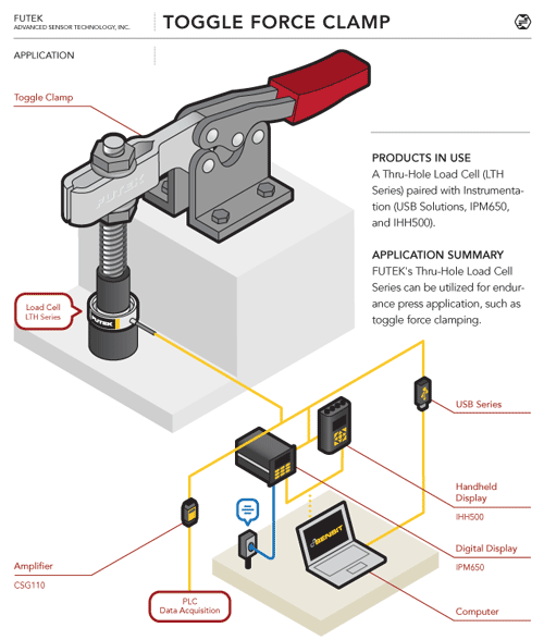 Clamp force measurements are very common throughout the test and measurement industry. Technicians will often need to measure or audit the exact force each clamp produces. As you can see in the above illustration, FUTEK's Thru-Hole Load Cells (LTH Series) can be utilized for endurance press applications, such as toggle force clamping. As an operator utilizes the toggle clamp, force measurements can be read directly on a digital display, such as FUTEK's IPM650 or IHH500, or directly onto a laptop using FUTEK's USB Solutions.With 5 distinct models of Thru-Hole (Donut) Load Cells, this compression application line offers high precision with robust construction over a capacity range of 50 lbs. to 50,000 lbs. Also, the LTH Series has over a dozen inner diameter variations and cable exits making them extremely versatile.