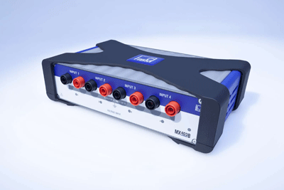 The MX403B module has four differential channels for the direct measurement of electric voltages and is fitted with high insulation for maximum security. Each channel is equipped with analog anti-aliasing filters, digital filters and 24-Bit A/D converters while it outputs data with sampling rates of up to 100 kS/sec/channel and acquires signal bandwidths of up to 38 kHz.