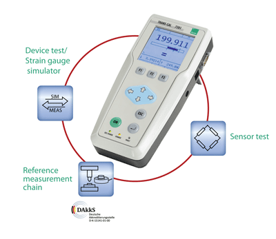 A dedicated version for reference measuring chain of compression load from 20 N to 100 kN with DKD/DAkkS calibration certificate is also available. The 72-REF-EN version uses the full featured 7281 for the calibration of press-fit force measuring equipment and is typically used with Bursters high precision 8527 series sensor and is supplied all connection cabling and DigiCAL PC software.