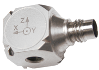 Type 8688A sensors feature an integral low-noise charge amplifier that converts the charge signal to a proportional high level voltage signal, at an output impedance of less than 500 ohms. Units are ground isolated when mounted with a mounting clip or adhesive mounting adapter.Type 8688A triaxial accelerometers offer an integral 4-pin connector, facilitating easy mounting and installation into space confined areas. Sensors may be mounted on any of three faces. The accelerometer operates directly from the internal power source found in most FFT analyzers, Kistler Piezotron® power supply couplers or any industry-compatible power source.