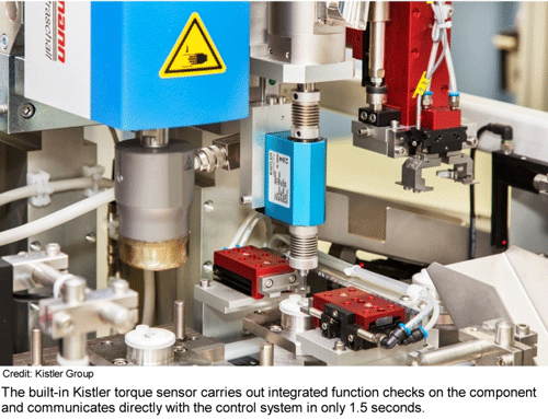 The solution Kistler proposed used a combination of a type 4502A torque sensor and the maXYmos BL evaluation system to check the torque curve for each individual product. The measurement value produced by the torque sensor is used to generate an OK/NOK signal transmitted directly to the control system so that any product with an out of spec torque curve is automatically rejected. This 100% testing ensures that only perfect products are delivered by the production cell.