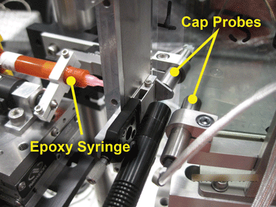 Previously, laser displacement sensors were used but were eventually abandoned because of insufficient resolution, size-related mounting difficulty, and generation of too much heat causing thermal expansion of the components during the delicate operation. The capacitive sensors are less expensive, small enough to easily mount, and generate virtually no heat during operation.