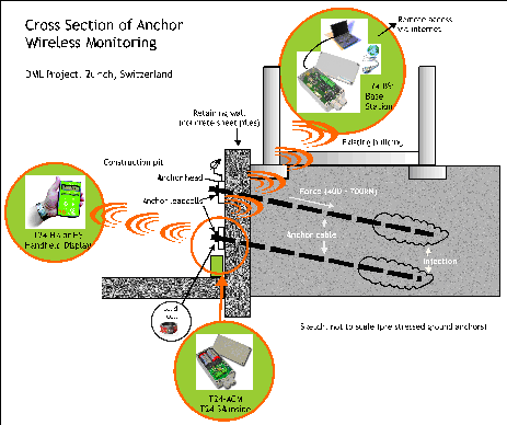 Working with the Geotechnical company, Mantracourt's innovative T24 radio telemetry devices are being used to wirelessly monitor the forces exerted upon cable anchors which are holding back concrete retaining walls within a construction pit (see image). The pit will be the start and end point of the tunnel boring machine digging the 5km tunnel and will eventually be 16 metres in depth.