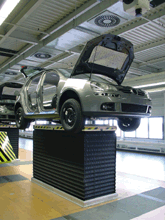 In elevating platforms for car production, one of the main features is that the sensor must operate very robustly and not be susceptible to faults. The resolution must be extremely high over the whole measurement range. Therefore, Micro-Epsilons type P60/P96 draw-wire sensors are used, which have a measuring range from 1m up to 3m.