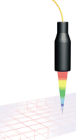 The desired distance or thickness data for the confocal principle is obtained from polychromatic white light. A conventional LED provides the light source. The sensors have a measuring range of 10mm and only measure the thickness from one side; the granite slab is also used as the reference surface. A scanCONTROL 2800 series laser profile sensor circumnavigates the pane during the traversing process. The edge is therefore inspected for flaking (small defects, chips or cracks) while simultaneously measuring the edge geometry of the pane. In this way, the surface profile of the edge of the pane can be accurately reproduced.
