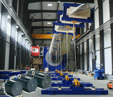The test rig at the Fraunhofer Institute simulates the distortion of rotor blades due to the effects of wind forces. The tip of the rotor blade can be distorted by up to 10m due to mechanical loads. The rig is designed to measure rotor blades up to a length of 70m.