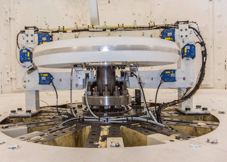 In addition to the optoNCDT 1700 sensors, the test rig was also equipped with four optoNCDT 1402 laser sensors (with a measuring range of 5mm), which were mounted underneath the test rig in a confined space. These sensors measured the run out, alignment and any other movements of the test rig, including the steel hub that the wheel is mounted to.