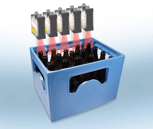 Compared with solutions based on conventional image processing systems, laser scanners not only monitor the presence of a bottle but also the height of the bottle. The sensor uses the respective bottle height to determine whether the correct type of bottle is in the crate. The bottle height must not deviate by more than 3mm from the target height of the respective bottle type.The PLC receives the result of the evaluation as an "OK" or "not OK" value, whereby any faulty crates can be removed directly from the production line. The user can also output the measured results via an integrated display on the control unit.