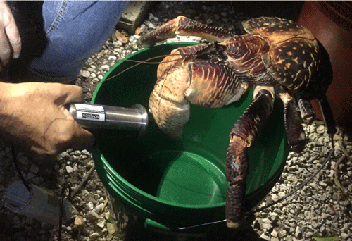 The team were conducting research into the relative size and strength of coconut crabs found on Pemba Island, in the Indian Ocean off the coast of Tanzania, compared to those found in their more common environment. Coconut crabs are the largest land-living arthropods in the world and a fully grown adult can reach 1m in span. The larger