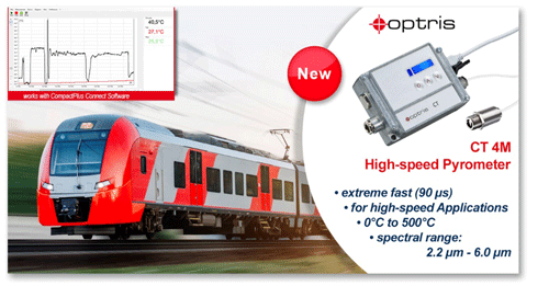 New high-speed pyrometer CT 4M from Optris - Where there is a need for speedWith very fast processes, requirements for the pyrometers used for temperature measurement are especially onerous. Typical examples are plastics processing machinery, such as those used for blow-molding PET bottles, which work on very short cycle times. Another application is the monitoring of rail vehicles, where the temperature of the wheelset bearings are measured as the train wheels pass the pyrometer, to be able to detect components running hot in good time. Optris now offers the new high-speed pyrometer CT 4M for these types of challenging tasks. With a detection time of just 90 µs, it is the fastest pyrometer within the product range at Optris.