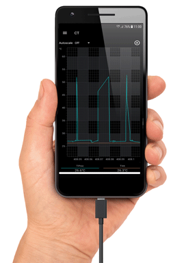 The integrated interface allows the CT 4M to be connected directly to a PC, where all settings can be fine-tuned in the CompactPlus Connect software. Date capture and recording are also possible using the software. Other serial interfaces or an Ethernet interface are also available as options. Instead of a PC, the pyrometer can also be connected to an Android mobile device which has the free IRmobile app installed. This allows the settings of the pyrometer to be adjusted very conveniently during commissioning or maintenance work directly on site.