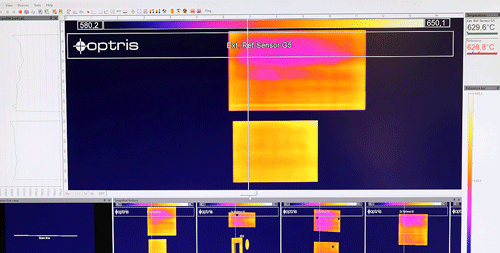 In order to achieve high energy efficiency in buildings, so-called Low-E glass is standardly used for windows and facade components.The windows designed as multi-pane insulating glass have a coated side with a very low emissivity, which leads to reduced heat radiation in winter and low heating of the rooms by solar radiation from outside in summer. However, the low emissivity poses a major challenge for the infrared measurement technology used. The new Top Down GIS 640 R solves this problem with a special configuration: Above the glass, at the exit of the oven, an infrared camera type PI 640 is installed, which quickly determines with high resolution the temperature distribution of the individual panes over the entire system.