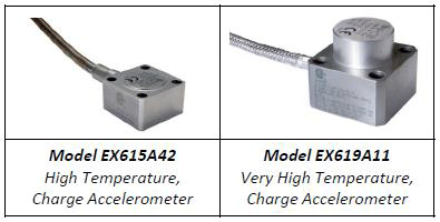Model EX619A11- offers a sensitivity of 50 pC/g, a measurement range of ±500 g peak and a frequency range (±5%) of 3 kHz. Designed for use in environments up to 900 °F (482 °C), the sensor has a Nickel 600 housing with an integral 7 ft (2.1 m) MI hardline cable terminating in a 2-pin MIL-C-5015 connector.