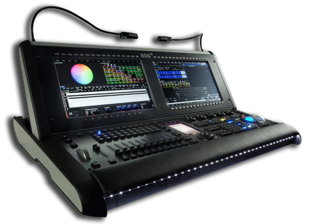 The console provides three monitor outputs, MIDI input and output ports, eight USB ports, and two Fast Ethernet ports on a rugged Neutrik Ethercon connector. To provide an unlimited number of simultaneous crossfades, the Hog 4 also features ten user-programmable Penny + Giles PGFM3000 motorized playback faders with illuminated enable buttons on the playback portion of the console; and a dedicated Grand Master motorized fader.