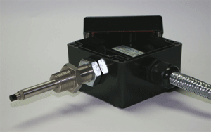 The self contained proximity probe assembly measures 120mm x 120mm x 120mm (H x W x D) and has a number of mechanical features to ensure suitability for a wide range of applications. The housing is a robust PPS thermoplastic incorporating conductive fibres for electrostatic dissipation making the overall probe system suitable for EEx ia IIC T4 applications.