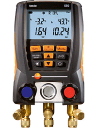 The new Testo 550 digital manifold provides high performance at an affordable price. The instrument's intuitive operation allows you to measure high and low pressure quickly and precisely, and with the two temperature inputs you can simultaneously calculate superheating and subcooling. The brightly illuminated display allows fast and easy readout of all measurement values and there are 31 refrigerants stored in the instrument, which can be selected via a direct button.