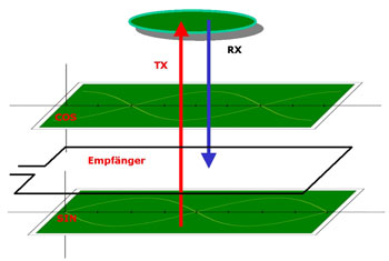 A sinusoidal and a cosinusoidal conductor loop are both located on the printed circuit board along the measurement stroke and are being supplied with alternating currents with a phase-shift of 90° degrees. This generates alternating fields perpendicular to the printed circuit board, while their strength over the measurement area is also sinusoidal and cosinusoidal. Based on the trigonometric addition theorem, the following relationship applies to the site-dependent sum of both fields: