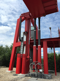 As conventional hydraulic linear position sensor types could not be considered due to the telescopic style long travel cylinders, Hunger designers opted for draw wire or cable sensor technology and chose the competitively priced Celesco SR1 for its well proven reputation in outdoor construction, agricultural and industrial equipment for rugged build quality and extended durability. For redundancy purposes, two sensors are mounted and work in parallel each side of the bridge. To ensure complete protection the sensor pairs are encased in a pivoting steel housing which includes telescopically extended cylindrical sections that fully enclose the cable.