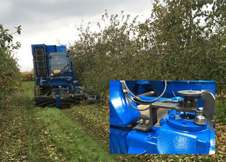 Image: Cider apple harvesting, four wheel synchronised steering with separate touchless magnet and sensor components allow maximum manoeuvrability for optimum harvesting rates