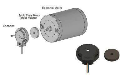 The classic installation configuration involves the target rotor magnet being attached to a motor shaft or other rotating element whilst the signal conditioning module is held fixed by its attachment to the motor housing. Pulses are delivered as single-ended (Channel A and B) or differential pulses A+, A-, B+ and B-), and thus when read into servo or other control/measurement systems correspond to bi-directional position, speed and acceleration. This robust design principle - non-contacting, without bearings and consisting of two encapsulated and fully sealed components - provides an exceptionally high degree of durability and a practically unlimited working life. Furthermore the technology competes very favourably on price with optical encoders where it also offers substantial benefits in terms of reliability and durability, especially where harsh environments prevail.
