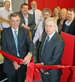 Cutting the ribbon at Zettlex's new production cell is David Coates, Head of Knowledge Transfer at the Technology Strategy Board and (right) Myrddin Jones, Head of Plastic Electronics at the Technology Strategy Board.