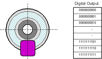 The absolute optical device is similar but uses a different kind of scale, whereby absolute position is determined at power up - without the need for a reference mark. Typically, these sensors have a digital output and their resolution is defined by the number of bits in the output. A 10-bit device will offer 1,024 counts; an 11-bit device will offer 2,048 counts and so on.