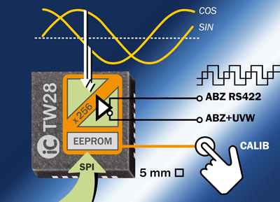 The device iC-TW28 provides several options for configuration. A subset of pre-configured functions and interpolation factors can be selected by pins, and the auto-calibration is easily available at the push of a button - the commissioning does not require any programming. In addition, the full range of functions can be achieved if the serial SPI interface is used: an AB output divider for fractional interpolation, filter settings for jitter reduction and configurable monitoring of errors and signal quality.