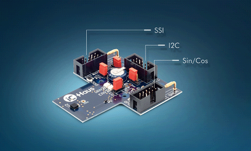 The development board PVL4M provides, for the first time, a TMR angle sensor (picture shows the application with the TA903 from Sensitec) in combination with the Hall sensor iC-PVL from iC-Haus for absolute angle measurement and revolution counting at the free shaft end, the so-called end-of-shaft position.